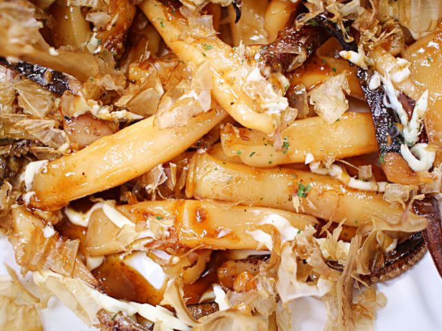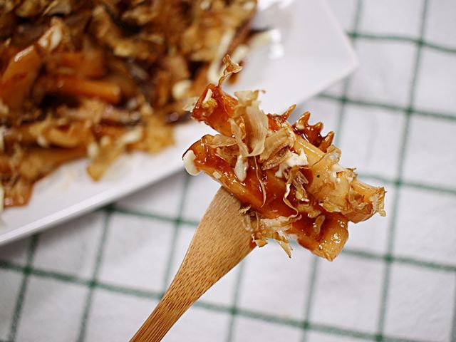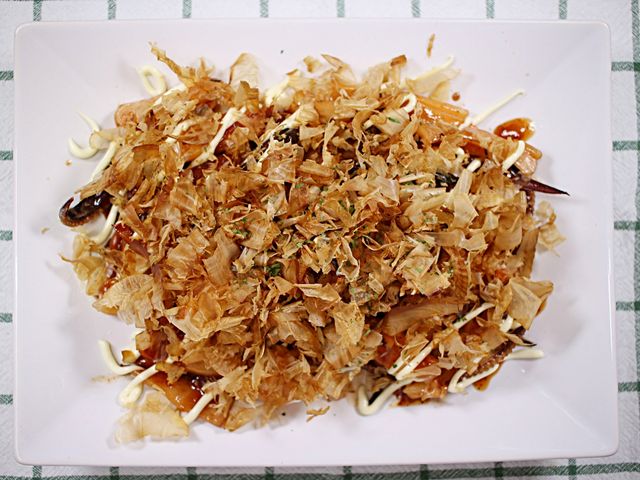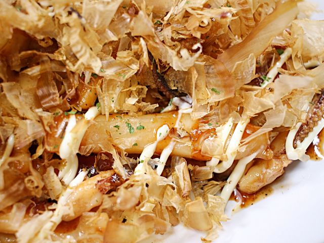 가쓰오부시 위에 마요네즈, 돈까스소스 뿌리고