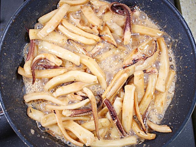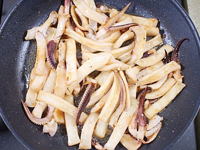 오징어가 절반 정도 익으면 소금, 후추로 살짝만 간을 해요.