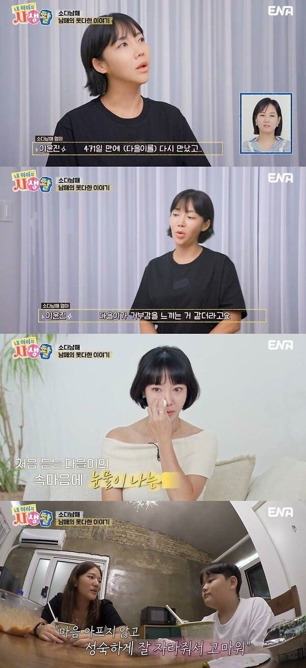 뉴시스 보도에 따르면, 통번역가 이윤진은 17일 방송한 ENA '내 아이의 사생활'에서 이범수와 이혼소송으로 인해 아들 다을을 못 만났을 때를 돌아봐며 "헤어져 있던 날을 매일 세어봤는데 471일 정도 됐다. (딸) 소을이와 다을이도 떨어져 있던 시간이 꽤 돼서 (다시 만나서) 둘이 같이 있을 때는 좀 어색한 기운이 있었다"며 눈물을 보였다.