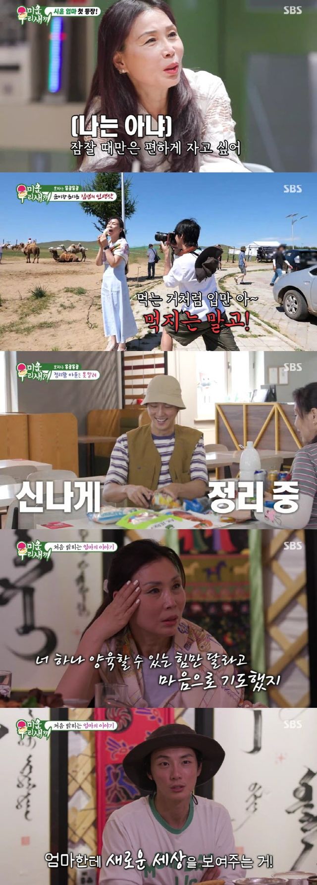 ‘칼각 정리왕’ 윤시윤이 어머니와 몽골 여행을 떠났다. 긴 생머리에 동안 미모를 뽐내며 등장한 시윤의 엄마의 모습에 모벤져스는 “진짜 엄마냐? 극 중에서 만난 엄마 같다”라며 연신 감탄했다. 단촐한 어머니 짐과는 달리, 꼼꼼하게 짐을 챙긴 윤시윤에게 시윤의 엄마는 “방을 같이 쓰는 건 싫다. 잠잘 때만은 편하게 자고 싶다”라고 솔직한 속마음을 드러냈다. 시윤의 엄마는 “너네 집에 다녀올 때마다 ‘저거 장가가기 힘들겠는데’ 생각한다”라고 덧붙여 폭소를 자아냈다.