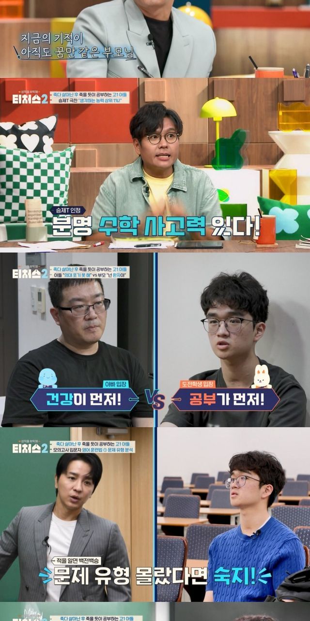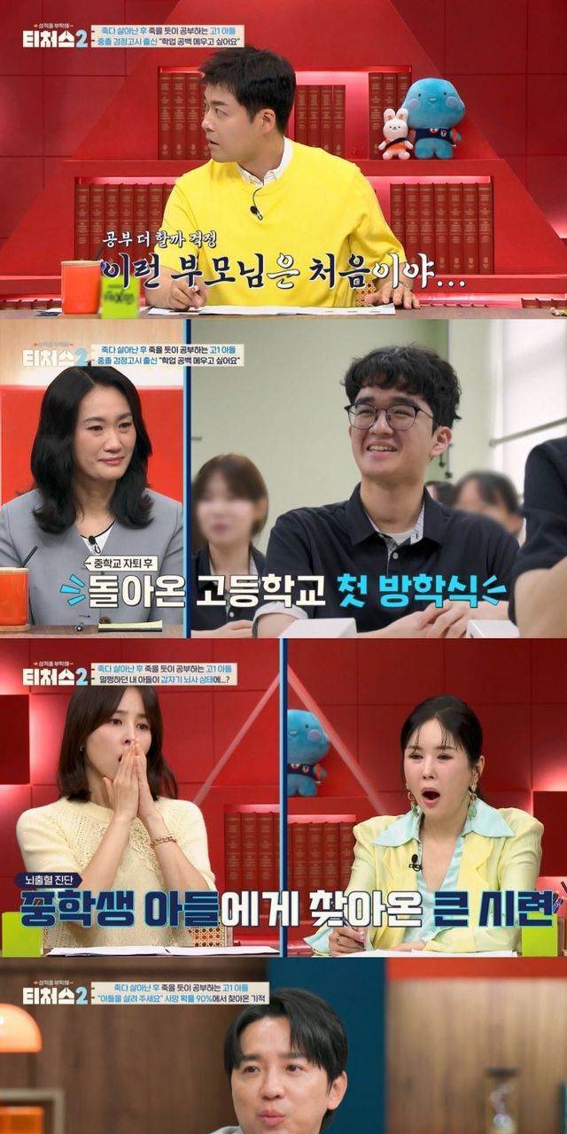 17일 방송된 ‘티처스2’에는 죽을 고비를 넘긴 뒤 죽을 듯이 공부에 집착하는 고1 도전학생이 등장했다. 도전학생은 중2 때 뇌출혈로 뇌사 판정을 받고 자퇴했다. 사망 확률이 90%라는 진단을 받았지만 도전학생은 기적적으로 회복했고, 고1에 다시 학교로 돌아올 수 있었다. 일상으로 돌아와 행복한 학교생활 중인 도전학생은 중학교 공부 공백으로 뒤처질까 두려워하고 있었다. 죽을 고비를 넘긴 만큼 도전학생은 ‘신경외과 의사’를 꿈꿨고, 쓰러진 후 팔이 움직일 수 있게 되자마자 병상에서 수학 문제를 풀 정도로 공부에 대한 열정이 가득했다.