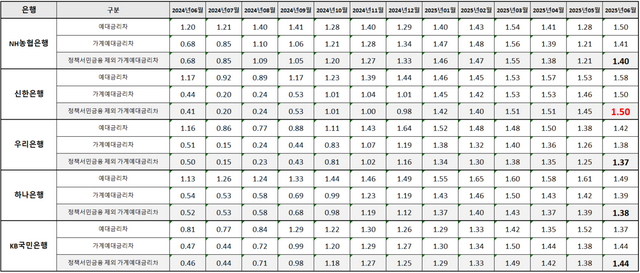 한 달 전보다 약 0.08%P 벌어지면서 2개월 만에 확대 전환한 것입니다. 1년 전(0.51%P)과 견줘서는 1%P 가까이 커졌습니다. 기준금리 하락에 은행들이 예·적금 상품 금리는 빠르게 내렸지만, 가계대출 관리를 위해 여신 금리는 높게 유지한 탓입니다. 은행별로는 ▲신한 1.50 ▲KB국민 1.44 ▲NH농협 1.40 ▲하나 1.38 ▲우리은행 1.37%P 순입니다.