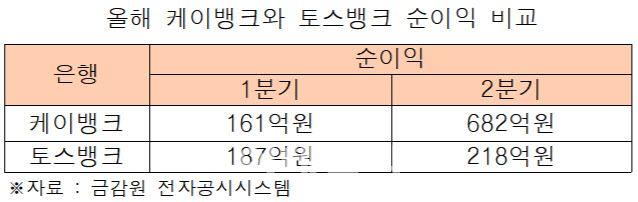 18일 금융권에 따르면 케이뱅크는 2분기 당기순이익이 지난해 같은 기간보다(347억원) 96% 증가한 682억원을 기록했다. 상반기 순이익은 842억원으로 지난해 같은 기간과 비교해 1% 감소했다. 같은 기간 토스뱅크는 65.6% 증가한 405억원의 순익을 기록했다.