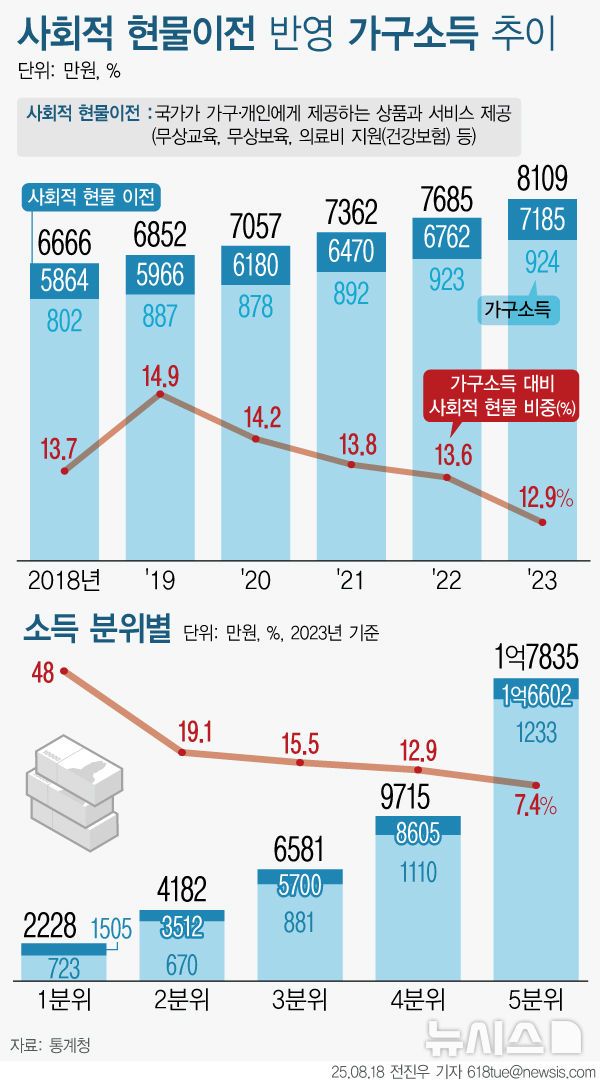 뉴시스 보도에 따르면, 18일 통계청이 발표한 '사회적현물이전을 반영한 소득통계 작성 결과' 자료를 보면 2023년 사회적현물이전소득은 평균 924만원으로 가구 소득 대비 12.9% 수준인 것으로 나타났다.