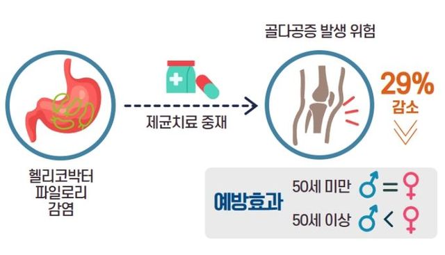 분당서울대병원에서 헬리코박터 검사를 받은 성인 846명을 대상으로 2003년부터 2023년까지 최대 20년(평균 10년)간 추적 관찰 연구를 진행한 결과, 제균 치료를 하지 않은 그룹(116명)의 골다공증 발생은 34.5%였으나, 헬리코박터 파일로리를 성공적으로 제균한 그룹(730명)은 24.5%로, 골다공증 발생 위험을 약 29% 감소시키는 것으로 확인됐다.