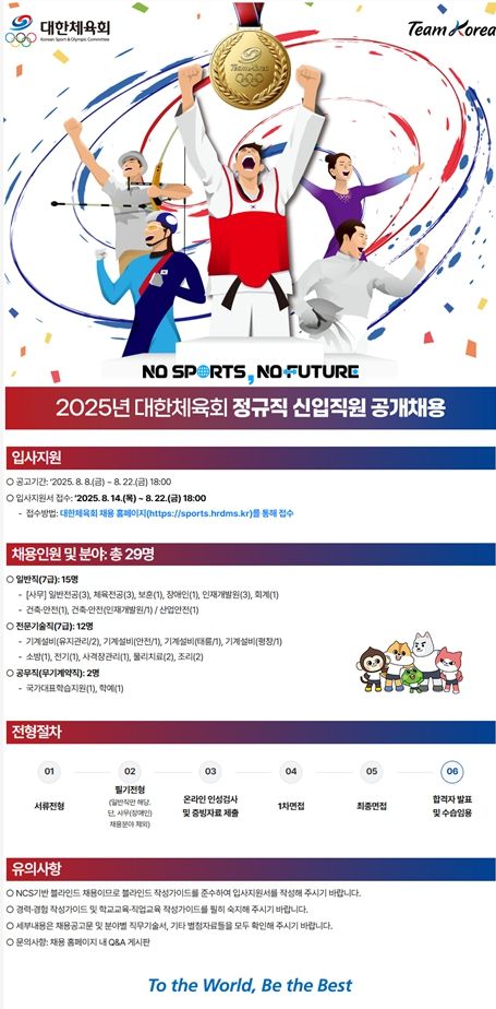 대한체육회는 ‘책임 있는 변화로 다시 뛰는 대한체육회’를 함께 구현할 2025년 정규직 신입직원 채용을 실시한다. 온라인 입사지원 접수는 8월 22일(금) 오후 6시까지 진행된다.