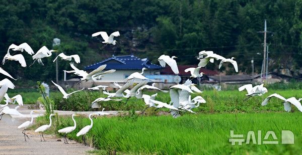 [서울=뉴시스] 전국 대부분 지역에 폭염경보가 내려진 18일 오후 경남 하동군 진교면 인근 들녘에서 휴식을 취하던 백로 한 무리가 인기척에 놀라 날아오르고 있다.