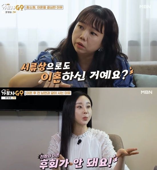 MBN '가보자GO(가보자고)'에 출연한 함소원은 진화와의 서류상 이혼이 맞으며 동거 사실도 인정했다. 심지어는 스킨십까지 여전하다며 할리우드 뺨치는 쿨함을 보였다. 하지만 위장이혼설, 재결합설에 대해서는 부인하며 강하게 선을 그었다. 현재는 진화와의 동거를 종료하고 딸과 함께한 근황을 전하고 있다.