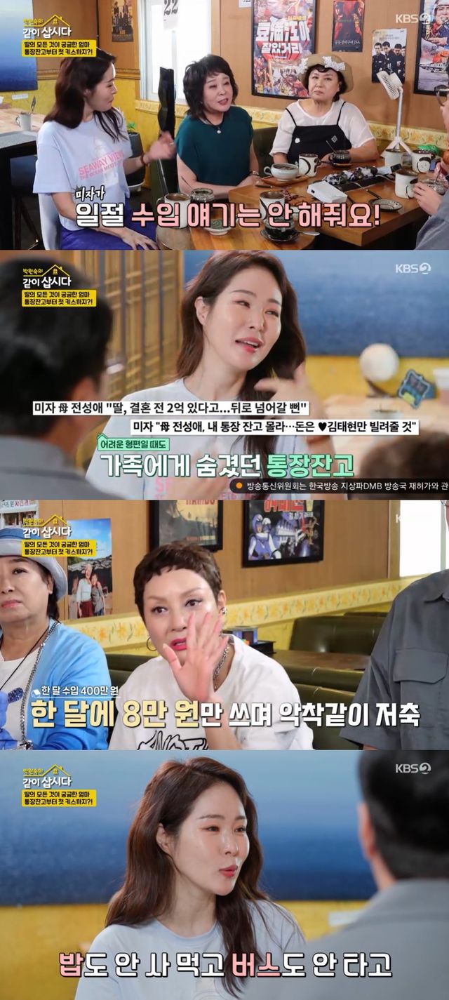 전성애는 딸이 5년간 라디오 DJ를 했을 시절에도 월급 이야기를 안했다고 밝혔는데, 미자는 "월급이 400만 원이었는데 한 달에 8만 원을 썼다. 밥도 안 사 먹고 버스도 안 탔다"라고 전해 놀라움을 자아냈다.