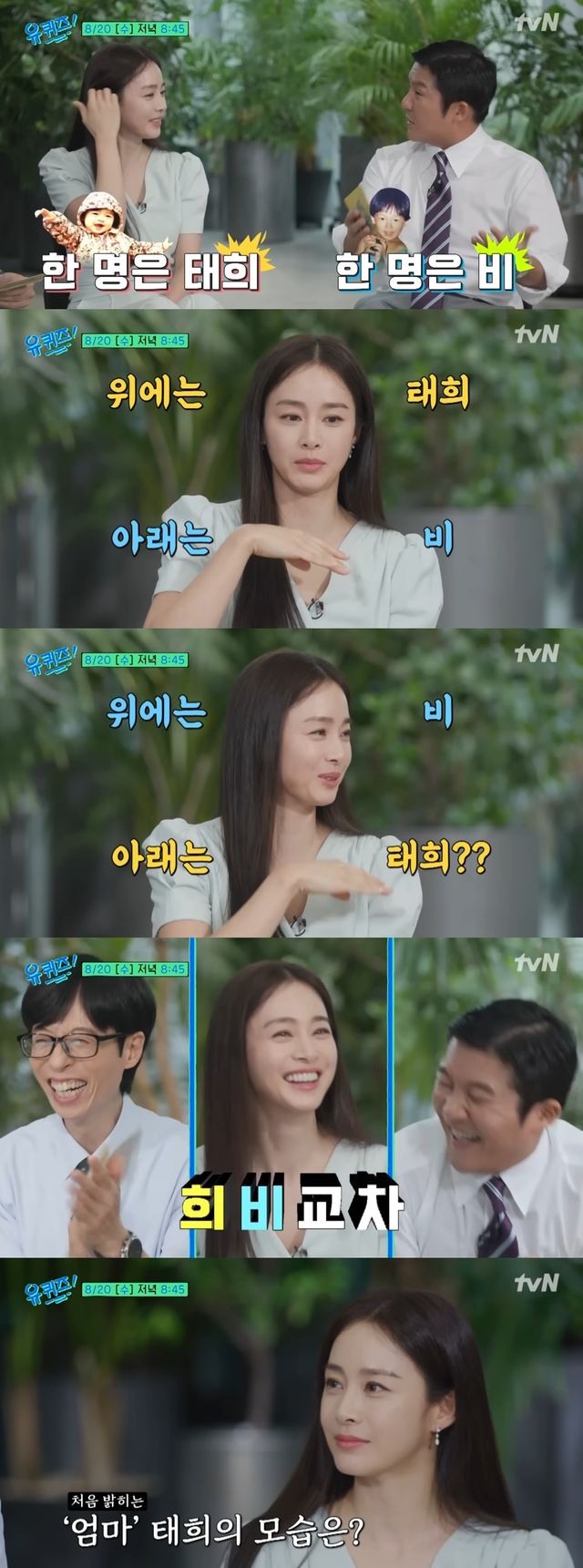이에 김태희는 "첫째는 위에는 저, 밑에는 남편이다. 둘째는 위에가 남편이고 밑에가 저다. 희비교차다"라며 딸에 대해 최초 공개했다.