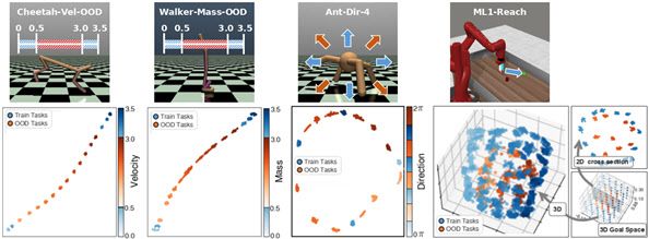 학습 기법을 치타, 개미, 2족 보행 등 다양한 로봇 시뮬레이션 환경에 적용해본 결과, 훈련하지 않은 임무에 대한 적응력이 향상되는 것으로 나타났다. 특히 치타 로봇 시뮬레이션(Cheetah-Vel-OOD) 실험에서는 TAVT 기법을 적용한 경우, 경험해 보지 못한 중간 속도에서도 목표 속도를 빠르게 파악해 안정적으로 주행을 했다. 반면 기존 메타강화학습 기법을 적용한 로봇은 적응이 느리거나 넘어지는 일이 잦았다.