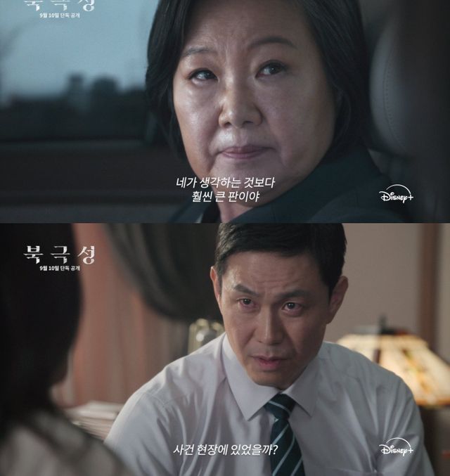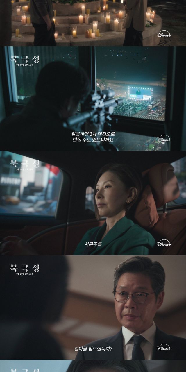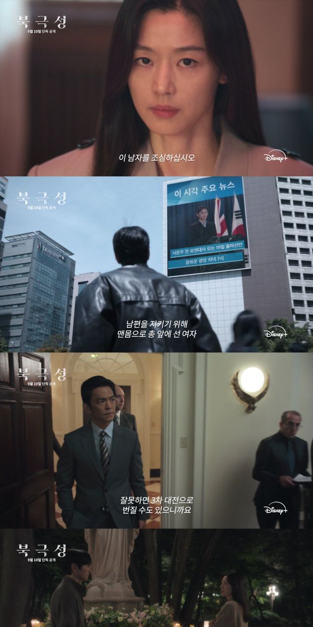 함께 공개된 메인 예고편은 ‘북극성’ 의 압도적인 스케일과 곳곳에 도사리는 위협 속에서 숨겨진 진실을 향해 나아가는 인물들이 만들어낼 드라마에 대한 기대를 한껏 높인다. 대한민국을 뒤흔든 대통령 후보 피격 사건의 배후를 파헤치고자 대선 출마를 결심한 문주는 목숨을 위협하는 위험한 사건들에 휘말리게 된다. 한편 사건 현장에서 문주를 처음 마주한 후, 멀리서 지켜보던 산호는 그녀를 지켜야겠다는 결심을 하고 “나를 고용하십시오” 라며 직접 제안을 한다. 이에 문주는 “무조건 명령에 따라줄 수 있겠어요?”라며 경계에 대한 긴장을 놓지 않는다. 또한, “이 남자를 조심하십시오” 라는 국가정보원장 유운학(유재명)의 날카로운 경고가 이어지면서 과연 그녀가 믿음과 의심의 경계 속에서 어떤 선택을 내릴지, 그들의 관계는 첩보 멜로 장르 안에서 어떻게 변화해갈지 궁금증을 자아낸다. 여기에 3차 대전으로 번질 수도 있을 거대한 위험이 한반도에 조금씩 가까워지고, 폭풍우의 방향을 조금이라도 바꾸고자 애쓰는 미 국무부 차관보 앤더슨 밀러(존 조)와 대통령의 자리에서 최선을 다하는 대한민국 대통령 채경신(김해숙), 대한민국의 정재계를 주무르는 영향력 있는 아섬해운의 회장 임옥선(이미숙), 대선 출마 야망을 가지고 문주를 쫓는 검사 장준상(오정세)까지. 전 세계의 안전을 위협하는 진짜 배후가 누구인지, 또 다가오는 폭풍우는 무엇을 상징하는지 호기심을 자극하는 가운데 문주는 “이 모든 걸 움직이는 각본이 따로 있다면, 내가 알아내요” 라며 강한 다짐을 보여주고 있어 시청자들의 호기심을 자극한다. 이들을 둘러싼 한 치 앞도 예측할 수 없는 스토리와 각자의 욕망을 가지고 앞으로 달려가는 캐릭터들의 팽팽한 대립은 ‘북극성’을 향한 전 세계의 기대감을 한껏 끌어올린다.
