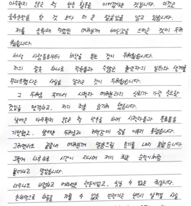 저의 잘못 하나로 직원들과 수많은 출연자의 일터와 생계를 무너뜨렸다는 사실을 알리는 것이 두려웠습니다.