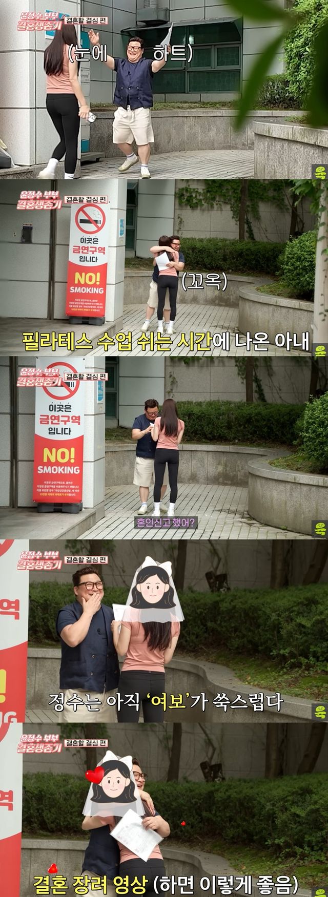 이어 그는 "자기야"라며 12세 연하 아내를 최초 공개했다. 윤정수 옆에는 필라테스 수업 쉬는 시간을 이용해 나온 아내가 등장했다.