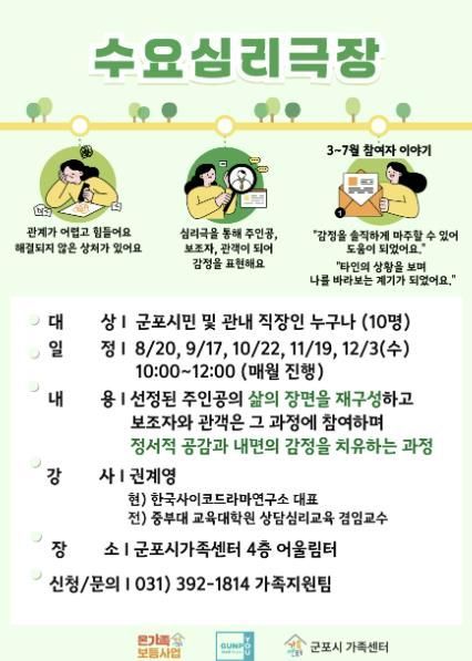 [와이뉴스] 군포시가족센터는 매월 셋째 주 수요일, 심리적 갈등과 대인관계 문제 해결을 돕는 집단심리치료 프로그램 ‘수요심리극장’을 운영하고 있다.