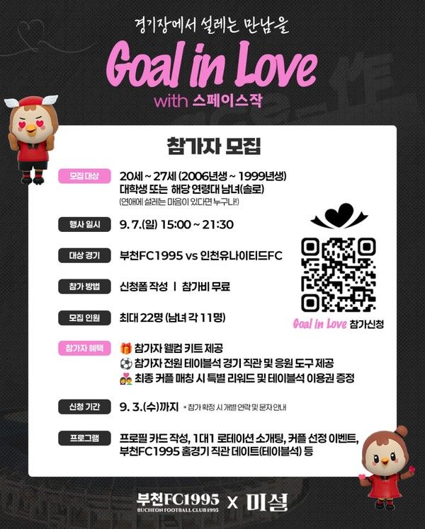 19일 부천은 보도자료를 통해 "20대 남녀를 위한 색다른 소개팅 이벤트 ‘GOAL in Love with 스페이스작’ 참가자를 모집한다"라고 밝혔다. 참가 대상은 20세(2006년생)부터 27세(1999년생)까지의 미혼 남녀로, 남녀 각 최대 11명까지 모집한다. 참가 신청은 9월 3일이며, 이후 최종 참가자를 선정할 예정이다.