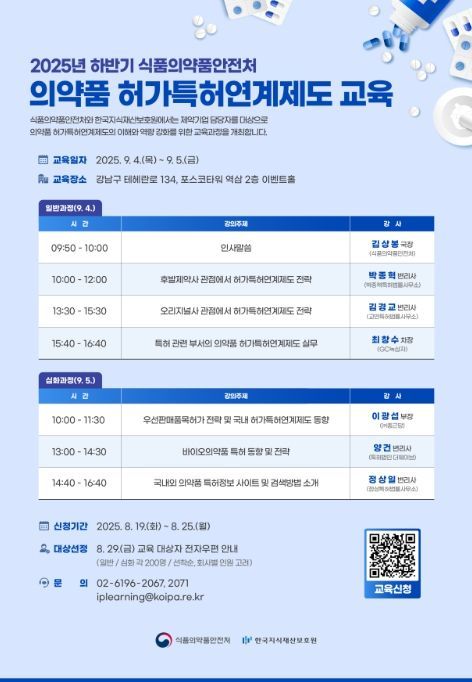 [와이뉴스] 식품의약품안전처는 의약품 허가특허연계제도 관련 제약업계 실무자 등을 대상으로 9월 4일부터 5일까지 2일간 포스코타워 역삼(서울시 강남구 소재)에서 ‘2025년 하반기 의약품 허가특허연계제도 교육’을 실시한다.