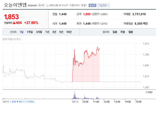 19일 오전 11시 37분 기준 오늘이엔엠은 전 거래일 대비 27.88%(404원) 오른 1853원에 거래되고 있다.