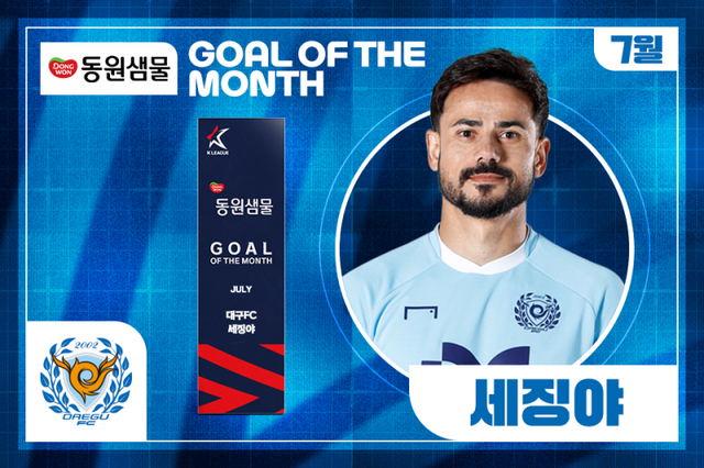 프로축구연맹은 19일 "세징야가 2025시즌 7월 K리그 ‘안심을 마시다 동원샘물 이달의 골’ 수상자로 선정됐다"라고 전했다.