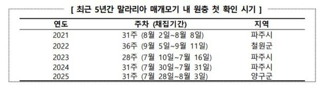 질병관리청에서 공개한 최근 5년간 말라리아 매개모기 내 원충 첫 확인 시기. / 질병관리청 제공