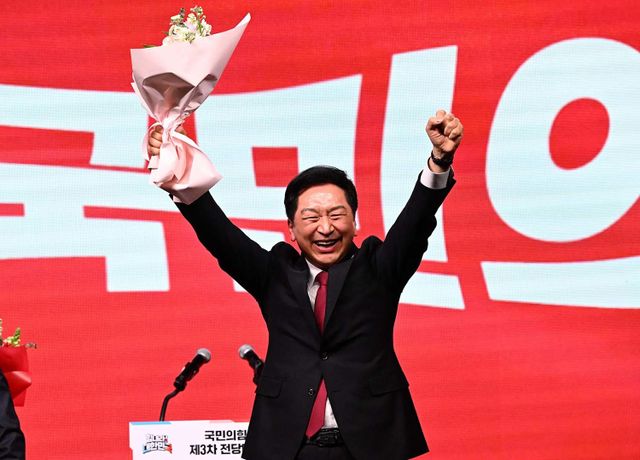 김기현 국민의힘 의원이 2023년 3월 경기 고양시 킨텍스에서 열린 전당대회에서 당대표에 선출되자 환호하고 있다. / 뉴스1
