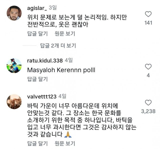 대부분 인도네시아인들은 남의나라 궁에서 입는 건 옳지 않다고 하는 중