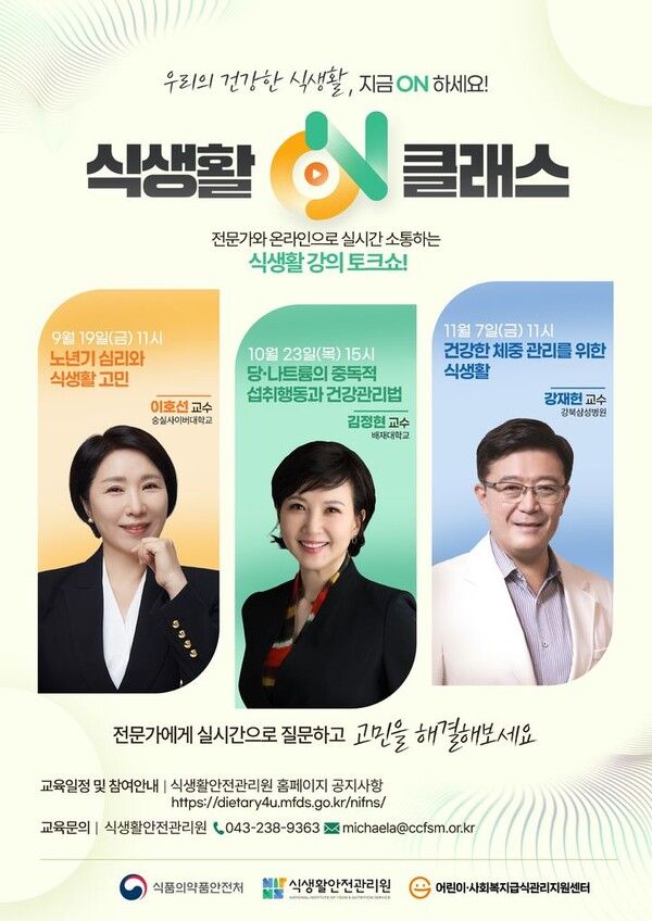 뉴시스 보도에 따르면, 식생활안전관리원은 9월부터 11월까지 매달 다른 주제로 온라인 토크쇼 특강 ‘식생활ON클래스’를 진행한다고 19일 밝혔다.