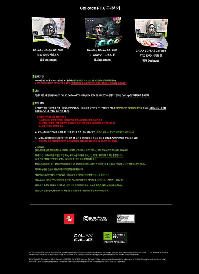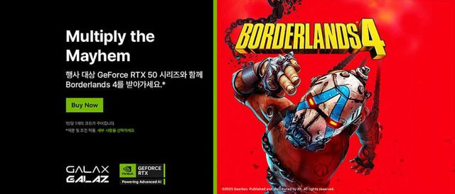 갤럭시코리아가 RTX 5080, RTX 5070 Ti, RTX 5070 그래픽카드 및 탑재 PC 구매 고객에게 ‘보더랜드4’ 게임 코드를 증정하는 프로모션을 8월 19일부터 9월 22일까지 선착순 한정으로 진행한다.