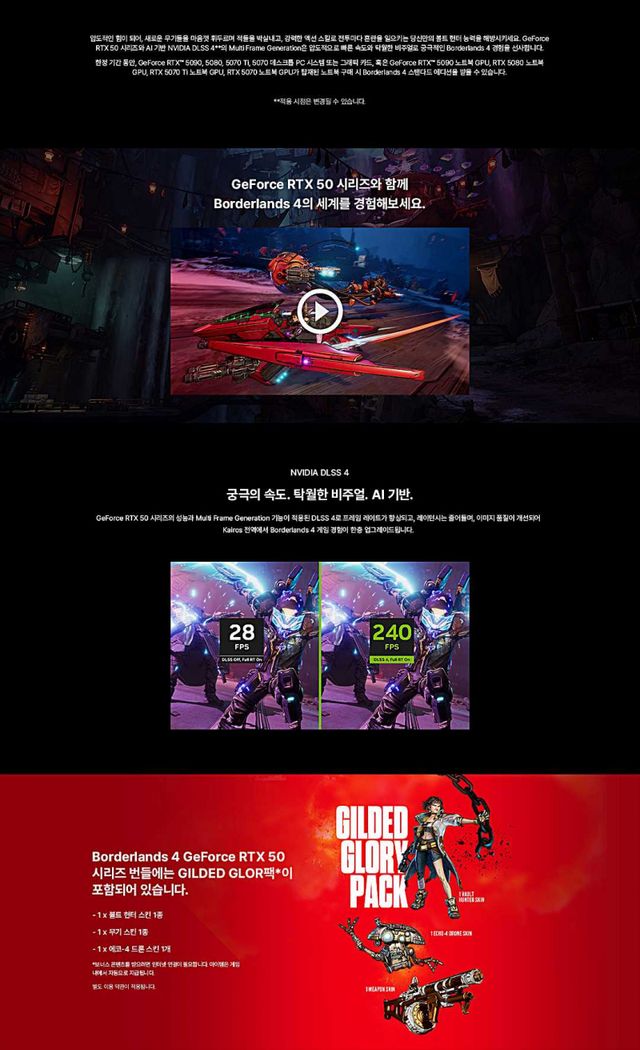 보더랜드4는 새로운 행성 ‘카이로스’를 배경으로 전작의 스토리를 확장하며, 언리얼 엔진5를 기반으로 구현된 사실적 그래픽과 다양한 콘텐츠를 제공한다. NVIDIA DLSS 4 기술이 적용돼 AI 기반의 고프레임, 고화질 게이밍 경험을 지원한다.