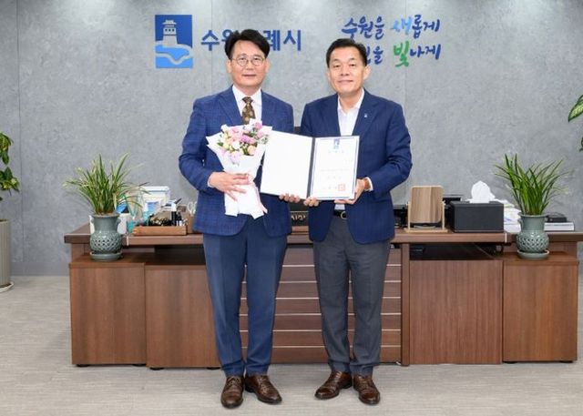 이재준 수원시장은 18일 집무실에서 정길배 신임 이사장에게 임명장을 수여했다.