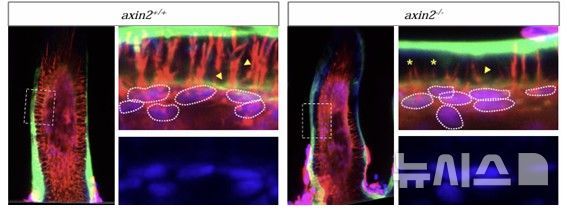 연구팀은 유전자 편집 기술인 '크리스퍼 카스나인'(CRISPR Cas9)을 통해 Axin2 유전자를 없앤 제브라피쉬는 몸 크기가 작아졌을 뿐만 아니라, 치아가 자라는 시점이 늦춰진 것을 파악했다. 치아가 단단해지기 위해 필요한 무기질 성분인 칼슘, 인의 양도 눈에 띄게 줄어들었다. 또 치아를 만들기 위한 주요 유전자들의 활동도 느려졌다.