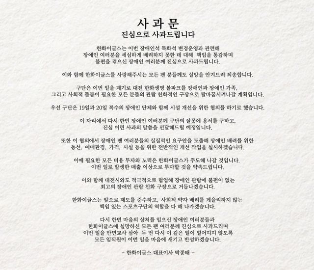 한화 구단은 이어 "대전시와도 적극적으로 협업해 장애인 관람에 불편이 없는 최고의 장애인 관람 친화 구장으로 거듭나겠다. 마음의 상처를 입으신 장애인 여러분들과 한화 이글스에 실망하신 모든 팬 여러분께 진심으로 사과드린다"라고 글을 맺었다.