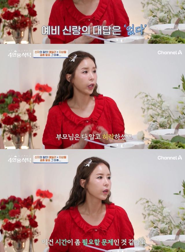 박경림은 집안 어른들의 반응을 물었고, 신지는 "부모님은 다 알고 허락하셨고 멤버들도 그렇다"고 밝혔다.