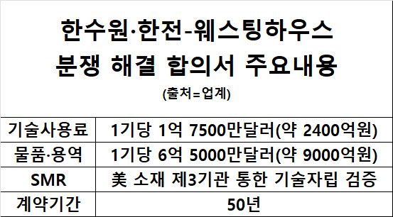 이번 합의는 약 26조원 규모의 체코 두코바니 원전 5·6호기 수주 과정에서 이뤄졌다. 한수원이 WEC를 제치고 이 사업을 따내자 WEC는 해묵은 지재권 문제를 꺼내 들었고, 정부와 한수원은 WEC에 발목 잡힐 것을 우려해 이번 합의를 진행한 것이다.