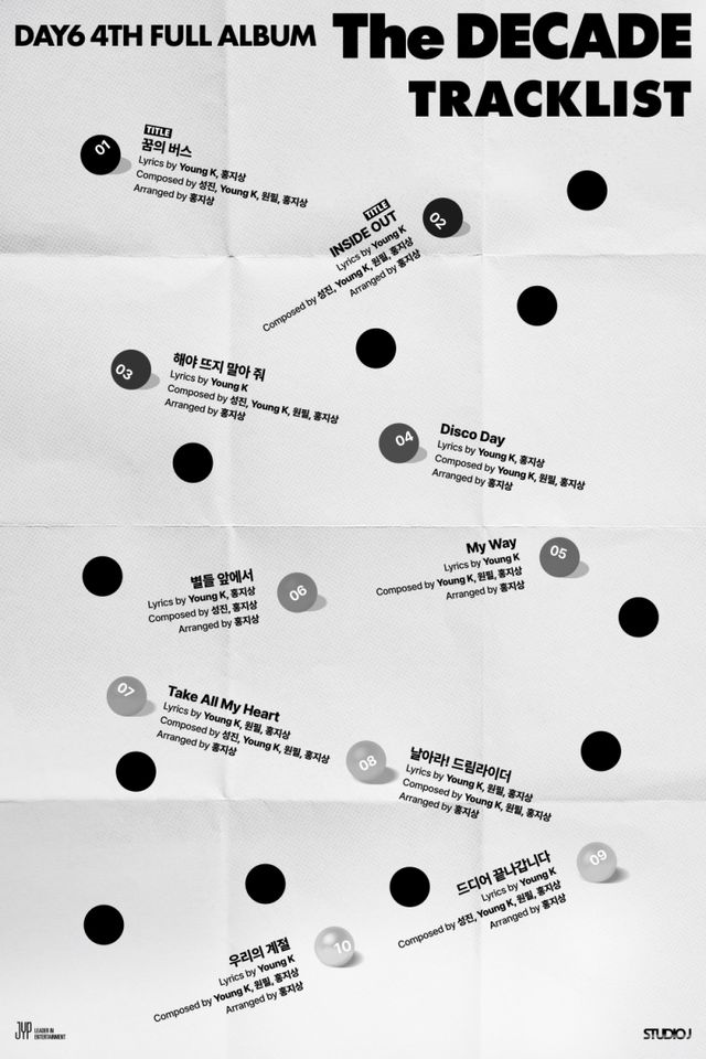 JYP엔터테인먼트는 18일 오후 그룹 공식 SNS 채널에 데이식스 네 번째 정규 앨범 ‘더 데키이드’의 트랙리스트를 공개했다. 이에 따르면 데이식스는 데뷔 이래 처음으로 더블 타이틀곡 ‘꿈의 버스’와 ‘인사이드 아웃’을 선보인다.
