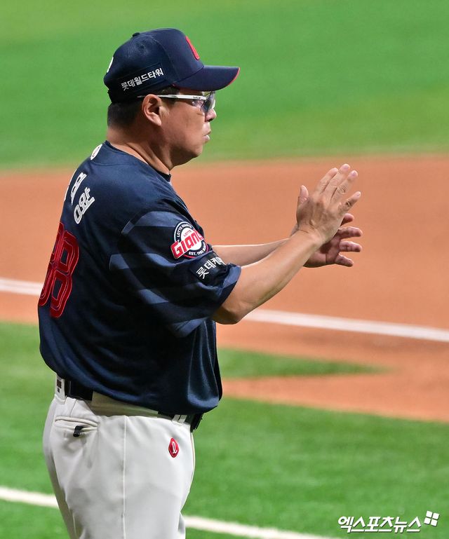 김태형 감독은 19일 부산 사직야구장에서 열리는 2025 신한 SOL Bank KBO리그 LG 트윈스와의 팀 간 12차전에 앞서 "김원중이 지난 17일 게임에서 동점 홈런을 맞았는데 (볼배합을) 내가 직접 요구했다. 포크볼을 계속 던지라고 했다"며 "삼성 김영웅 뒤에 타자들이 약한 데다 김영웅이 웬만한 공은 다 따라 나오는 스타일인 점을 고려했다"고 말했다.