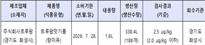 식품의약품안전처(처장 오유경)는 식품제조·가공업체인 ‘주식회사트루팜(경기도 화성시 소재)’이 제조·판매한 ‘트루팜맛기름(식품유형 : 향미유)’에서 벤조피렌이 기준치 보다 초과 검출되어 해당 제품을 판매 중단하고 회수 조치한다고 밝혔다.