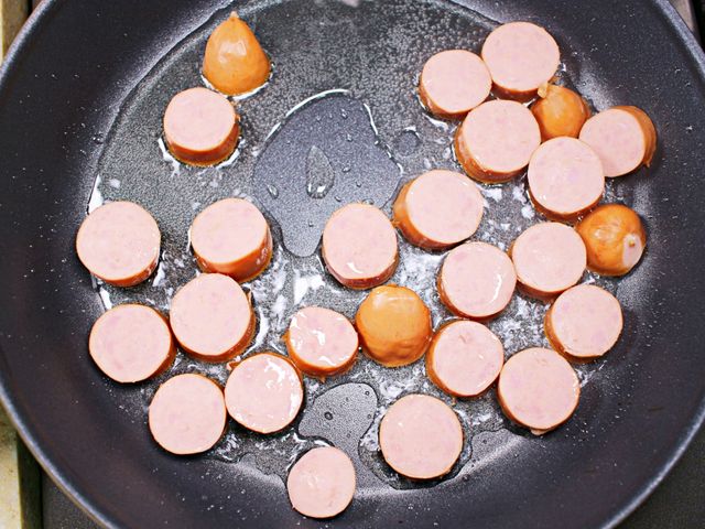 팬에 기름을 두른 뒤 소시지를 튀기듯이 볶아요.