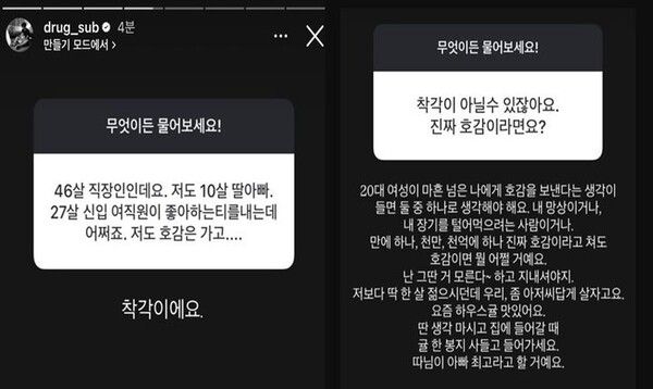 팔로워들 중 자신을 10세 딸을 둔 아빠라고 밝힌 한 남성은 "46살 직장인인데 27살 신입 여직원이 좋아하는 티를 내는 데 어쩌나. 저도 호감은 간다"라고 물었다.