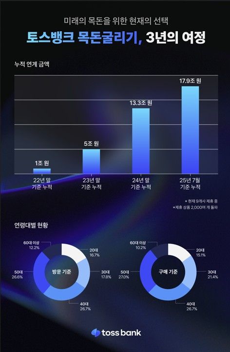 토스뱅크는 지난 14일 ‘목돈굴리기’ 서비스의 누적 연계 금액이 18조원에 육박했다고 밝혔다. 불확실한 금융환경 속에서 안정적인 수익률을 추구하는 채권형 및 발행어음형 상품에 대한 수요가 증가하면서 관련 서비스도 크게 성장했다는 설명이다. 지난해 말 기준 개인 투자자들의 채권 순매수 금액이 41조6000억원 수준인데 이 중 약 6조원이 목돈굴리기를 통해서 매수된 것으로 나타났다.