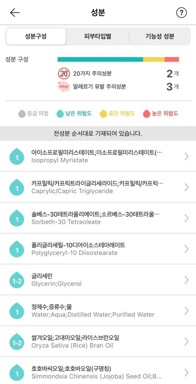 ‘화해’앱에서는 화장품 성분과 위험도를 직관적으로 확인할 수 있다.