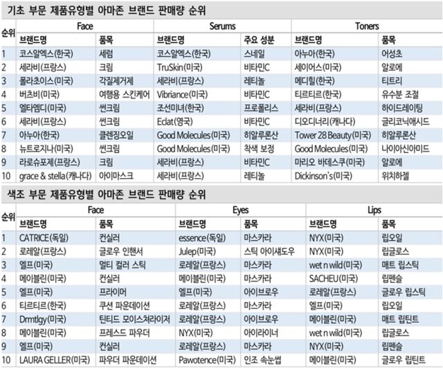 아마존 화장품 브랜드 판매량 Top10에 보이는 다수의 한국 인디 화장품 브랜드 (출처 : 신한투자증권)