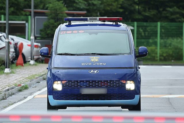구속된 김건희 여사를 태운 호송차가 14일 오전 서울 구로구 서울남부구치소에서 특검 사무실로 향하고 있다
