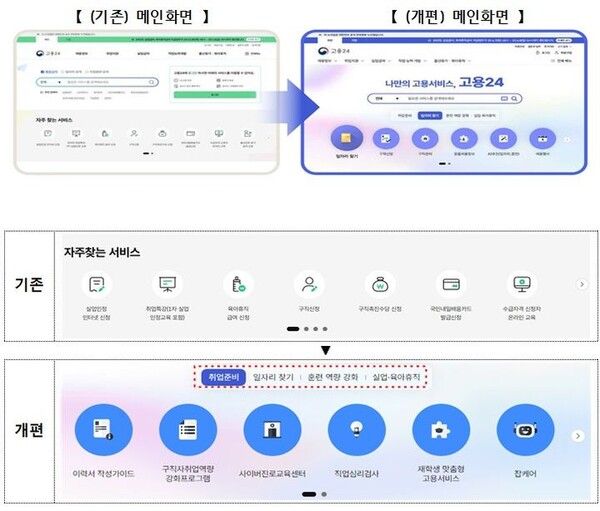 또 이용 빈도가 낮은 카드형 콘텐츠 대신 사용자들이 가장 많이 찾는 일자리와 훈련 정보를 전면에 배치한 것이 특징이다. 기존에는 문장형으로 구성돼 있던 114개 고용정책 지원제도 안내도 아이콘과 핵심 키워드로 재구성해 가독성을 높였다.