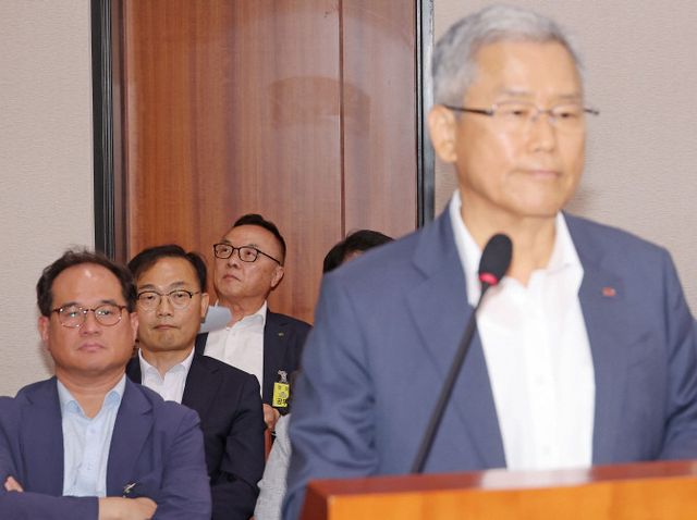 황주호 한국수력원자력 사장이 지난 19일 국회에서 열린 산업통상자원중소벤처기업위원회 전체회의에서 김동철 한국전력 사장의 미국 웨스팅하우스 지식재산권 분쟁 종료 합의문과 관련 발언을 들으며 부채질을 하고 있다. ⓒ 연합뉴스