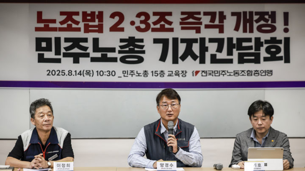 그러면서 노총은 "노조법 2·3조 개정은 더 이상 미룰 수 없다"며 "기업이 마음대로 해고·외주화·공장폐쇄를 강행할 수 있도록 방치하는 사회는 더 이상 지속될 수 없다"고 했다.