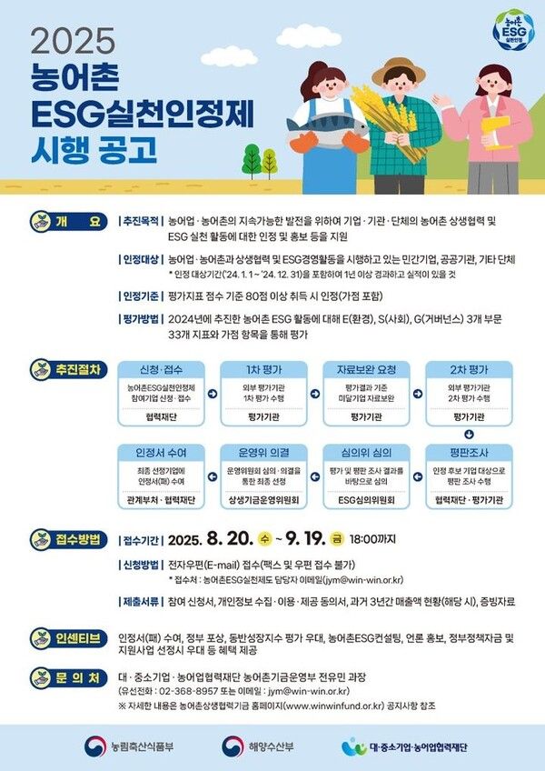 선정된 기업·기관에는 인정패(서) 수여 외에도 농식품부·해수부·산업부 장관 표창 등 정부 포상이 주어진다. 또 동반성장지수 평가 우대, 정책자금 지원 한도 확대 및 금리 우대, 농어촌 연계 ESG 컨설팅 지원, 우수사례 홍보 등 다양한 혜택도 제공된다.