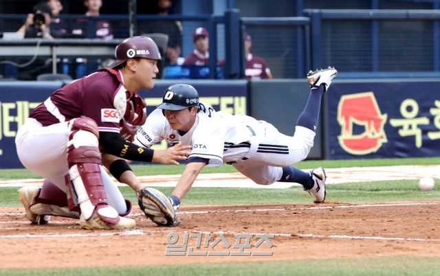 정수빈은 9회 초 1사 3루에서 2루 땅볼을 굴렸다. 3루 주자 이유찬(27)이 홈으로 쇄도해 간발의 차이로 결승 득점을 올렸다. 둘은 더그아웃에서 서로를 격려하며 미소를 나눴다.