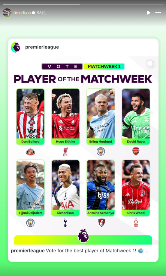 잉글랜드 프리미어리그(EPL) 토트넘 공격수 히샬리송이 개막전 맹활약으로 ‘이주의 선수’ 후보로도 꼽혔다. 선수 본인은 해당 소식을 자신의 소셜미디어(SNS)에 게시해 팬들의 눈길을 끌었다.