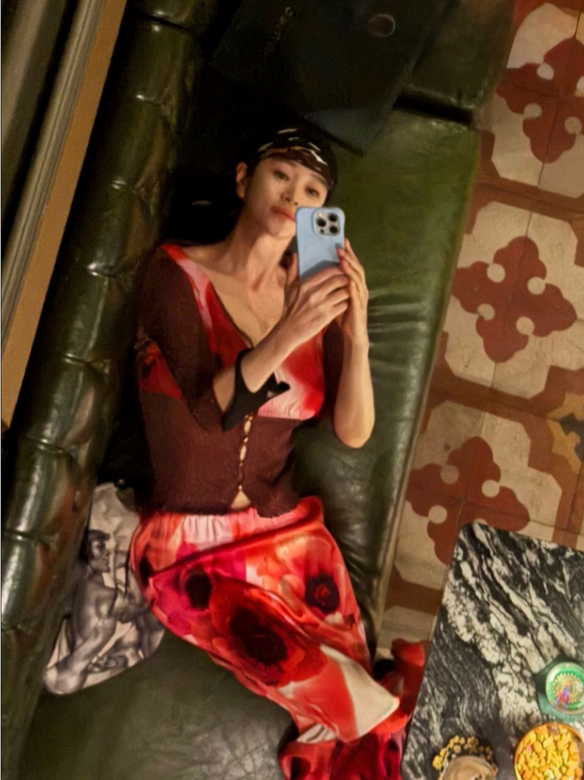 김혜수는 19일 소셜 계정에 별다른 멘트없이 사진을 공개했다. 그는 레드 패턴 스커트에 브라운 카디건을 매치한 세련된 스타일로 소파에 누운 채 거울 셀카를 남기고 있다. 누워 찍기 어려운 각도임에도 김혜수는 무너짐 없는 턱선과 완벽한 라인으로 시선을 사로잡았다.